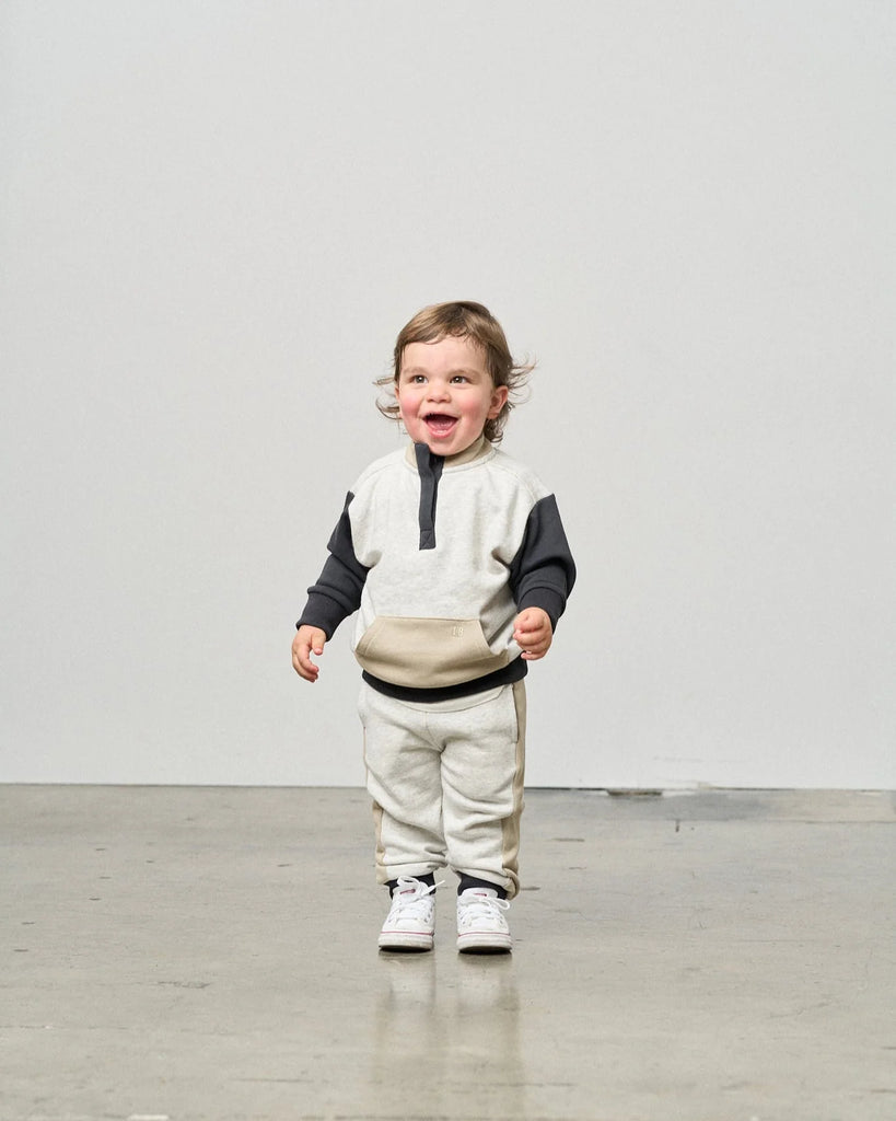 Everyday essential, upgraded. With a sporty mockneck collar and hidden snaps for quick + easy changes, this pullover is built for comfort and ease. Ribbed neckline, cuffs, and hem keep the fit snug, while rollable cinched cuffs make it easy to wear their way. The stone grey colorblock brings a timeless, laid-back vibe that goes with anything.