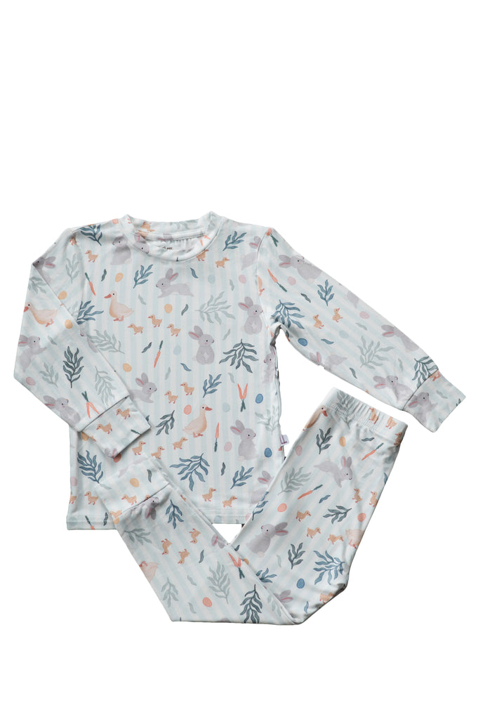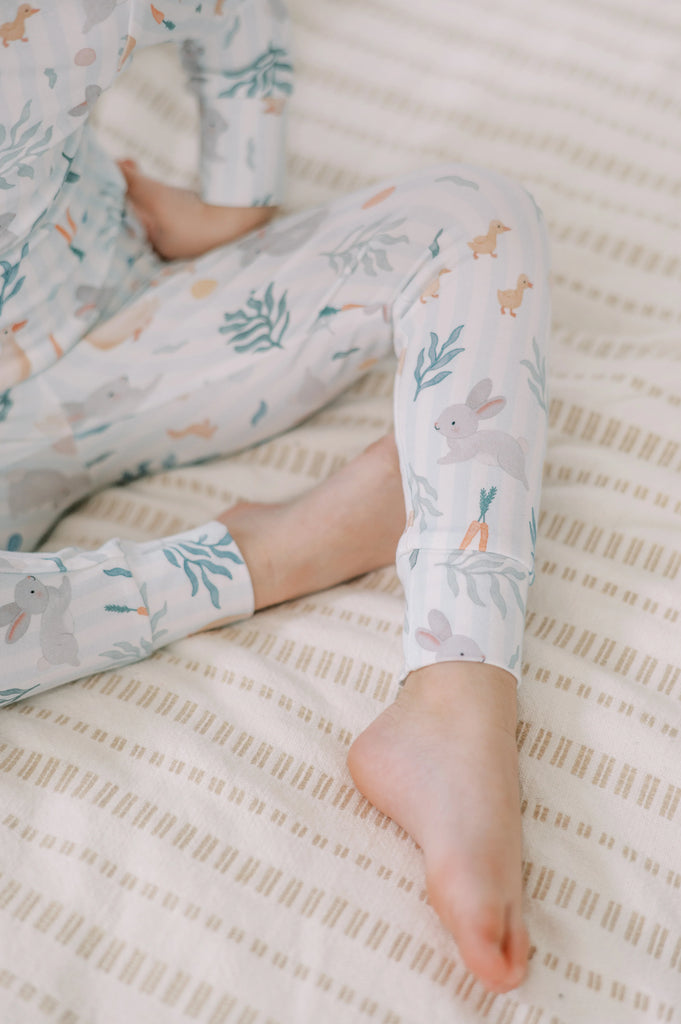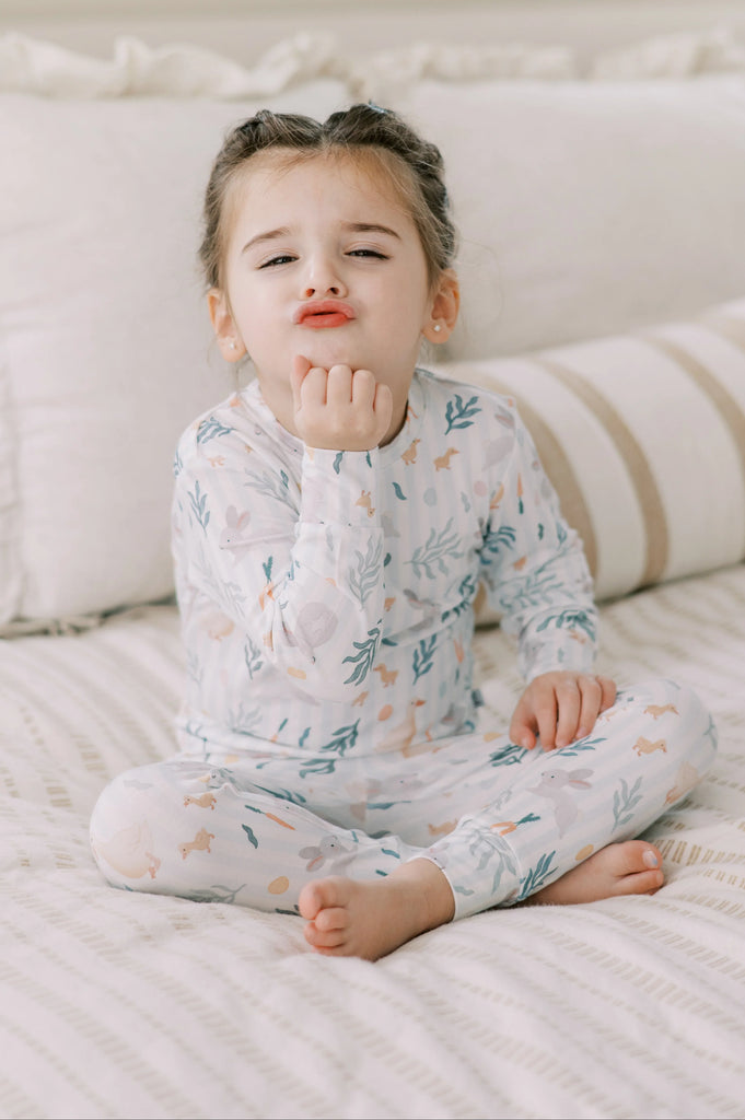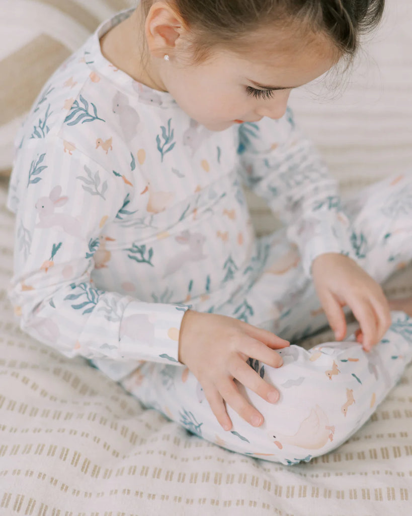 A limited-edition ode to Easter, our Meadow Friends print blends sweet springtime motifs and scattered pastel eggs in a soft, vintage-inspired palette. Our buttery-soft, breathable Bamboo Lounge Sets are designed with all-night comfort in mind, featuring a gentle stretch for easy movement — perfect for chasing eggs on Easter morning.