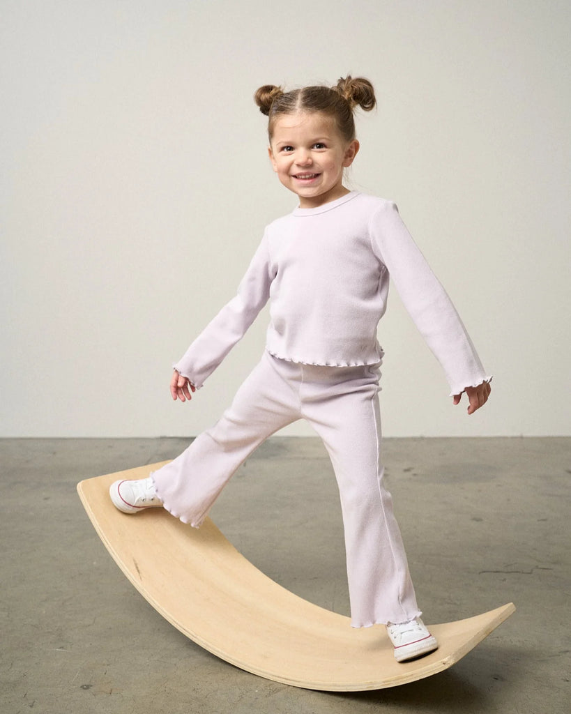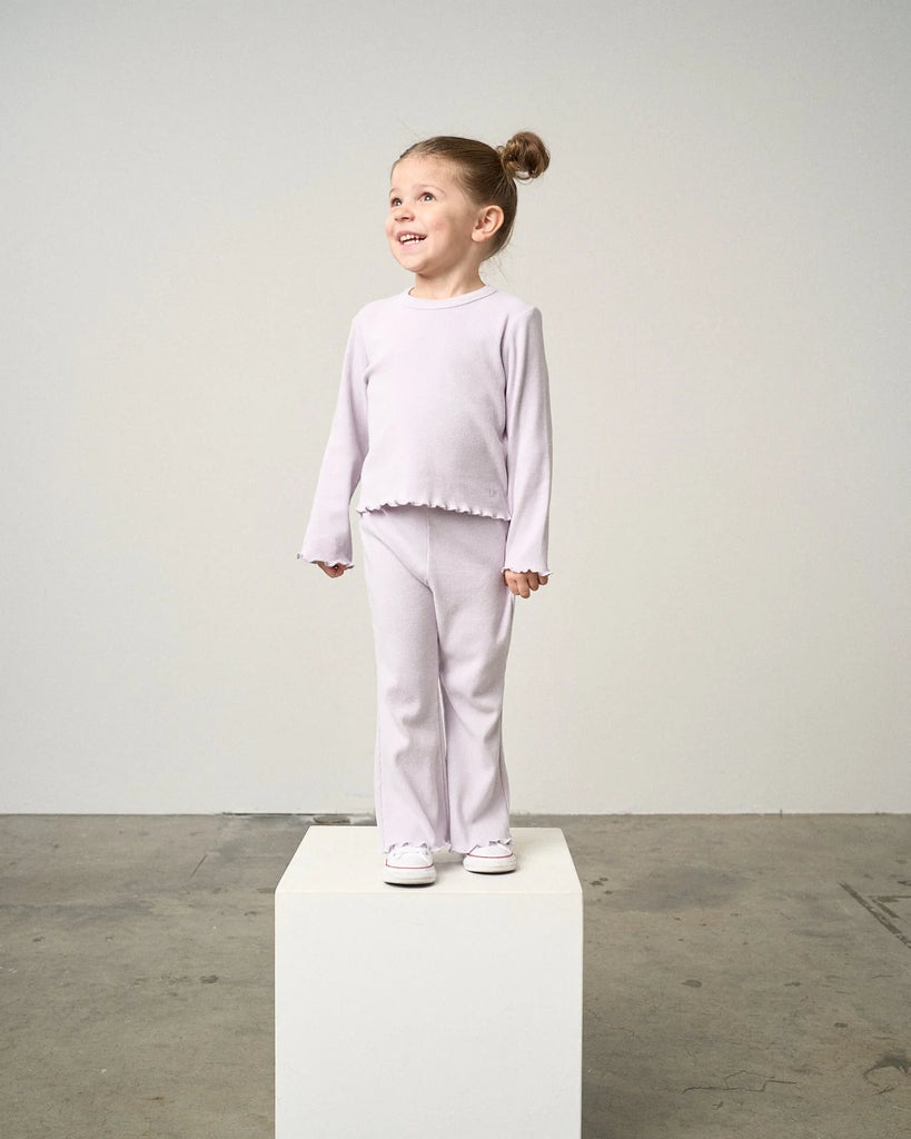 An easy everyday essential with a subtle twist. Made from our soft brushed ribbed fabric in a soft Lilac hue, this long sleeve tee features delicate lettuce trim on the cuffs and hem for a clean, elevated look. Finished with a ribbed neckline and our signature embroidered “LB” logo—simple, comfy, and made to mix and match.