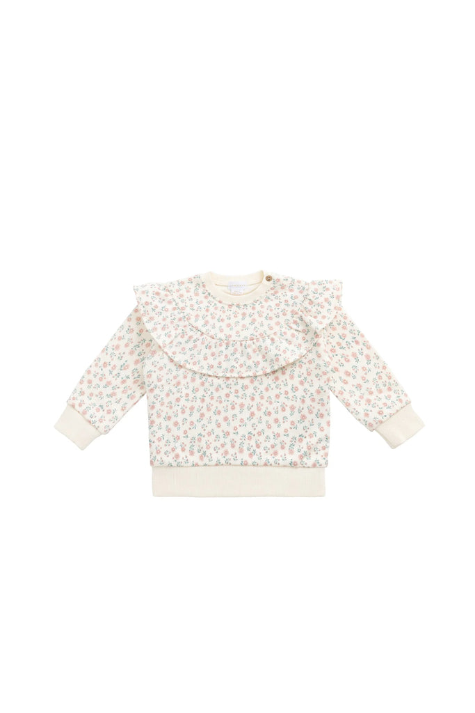 The Mckinley Sweatshirt – Posy Garden Pink is a beautifully soft and feminine piece, featuring a delicate floral print of pink and blue blossoms on a creamy white base. With long sleeves, ribbed cuffs and hem, and a ruffled collar that extends over the shoulders, this sweatshirt adds a dainty touch to everyday comfort.