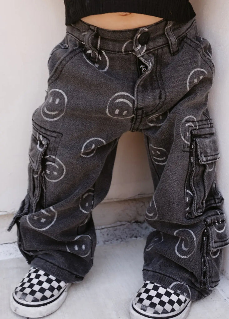 The SMILEY FACE jeans that GO WITH EVERYTHING — black denim stamped all over with smileys, finished with double-stacked cargo pockets for maximum stash space. And the best part, a thunder bolt pocket on the back pocket. Same relaxed baggy fit, same soft + stretchy feel, just turned up in black. Custom LT hardware and an easy elastic waistband make them the comfiest jeans in rotation.
