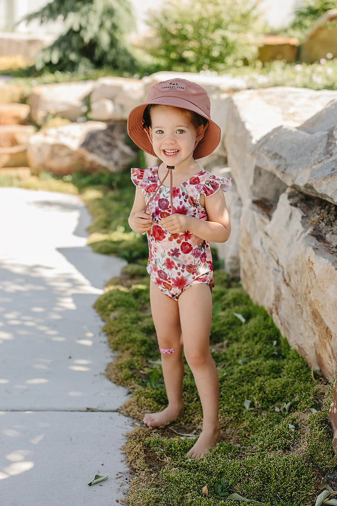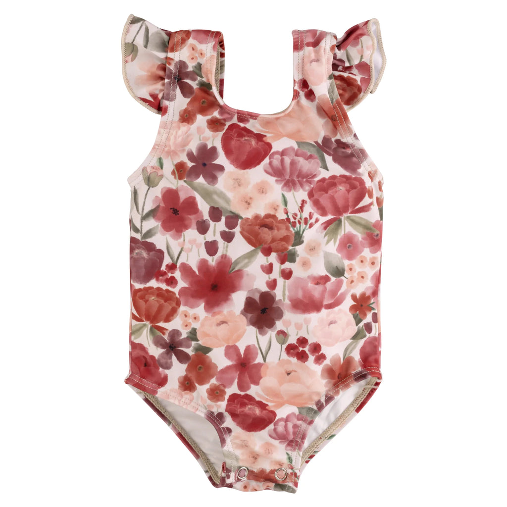 This swimsuit has an easy on and off design with the ruffle cap sleeve shoulder adding a feminine touch and extra sun protection to the shoulder area. The perfect swimsuit for everyday wear, or for little ones who prefer their suit without arms.